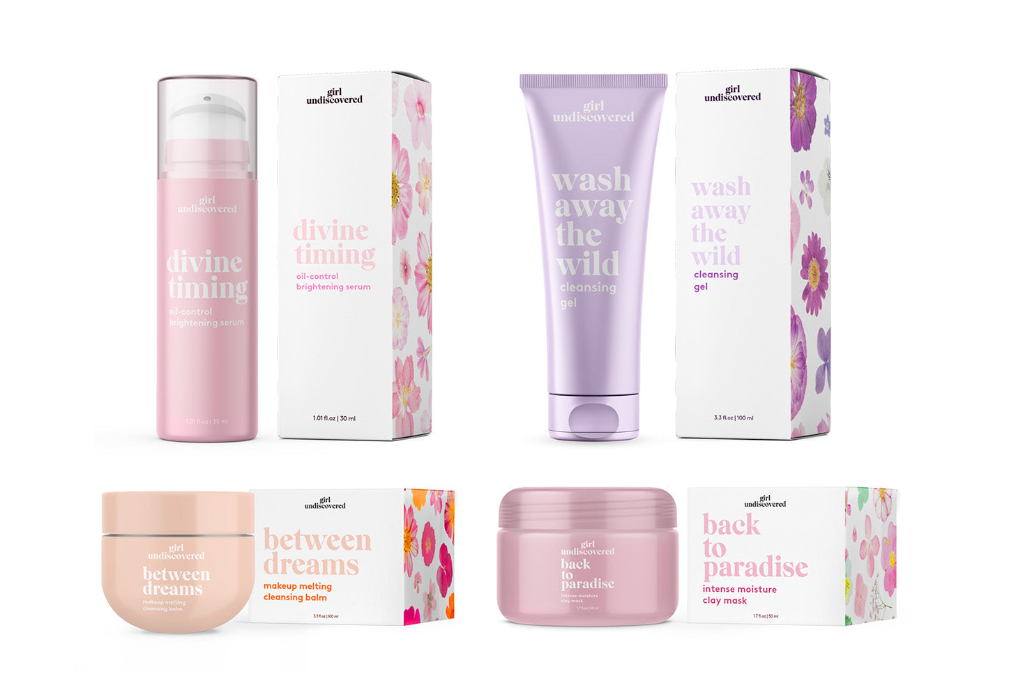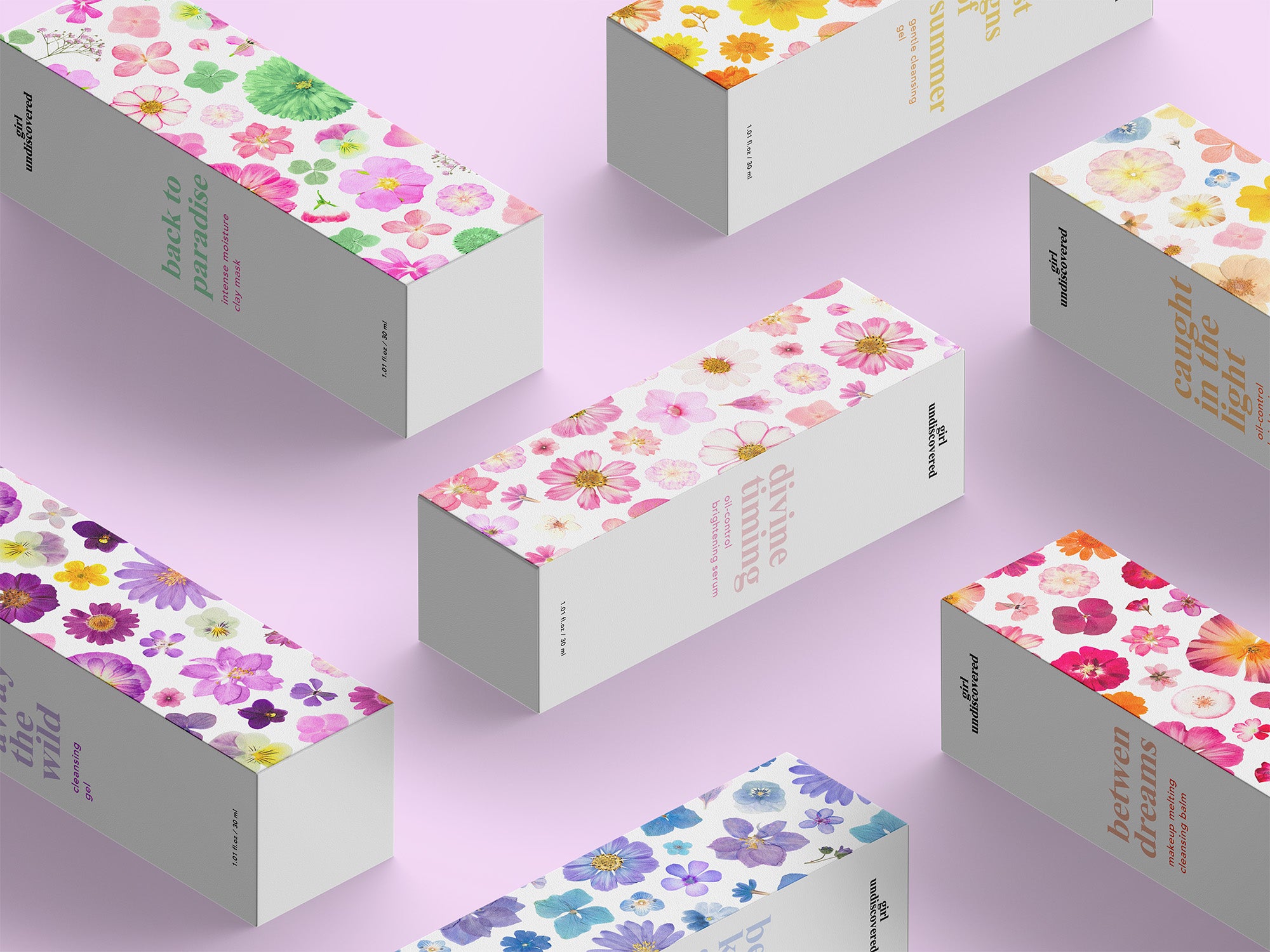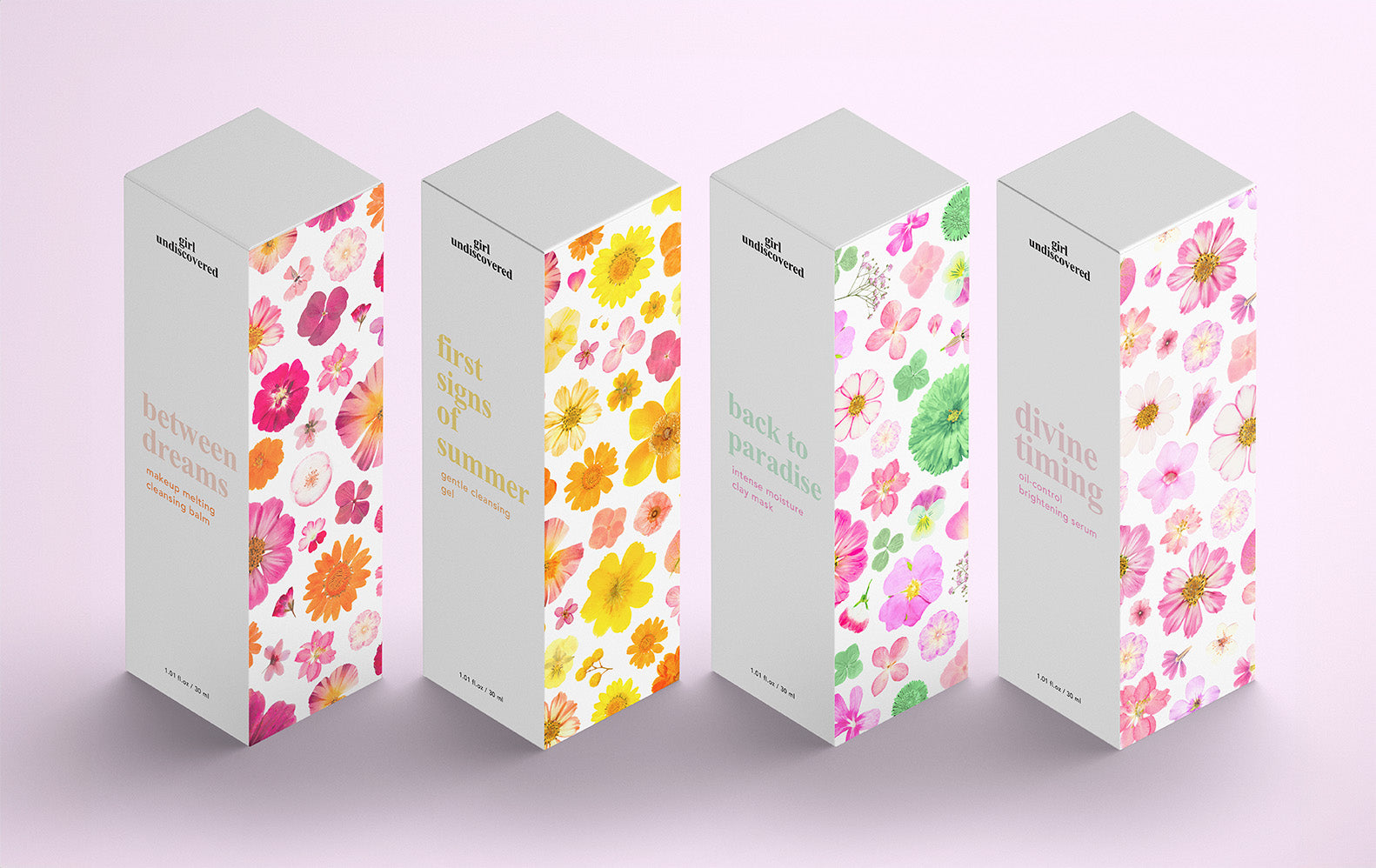 Création de motifs pour les packagings secondaires de produits skincare de la marque Girl Undiscovered. Chaque motif a été imaginé et travaillé en fonction de l'extrait floral présent dans la formulation du produit. Toutes les fleurs sont des scans de fleurs pressées par mes soins.