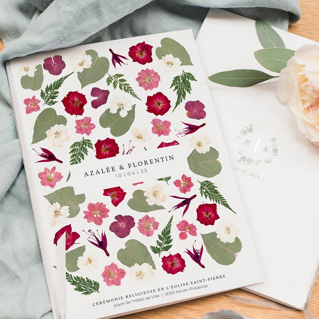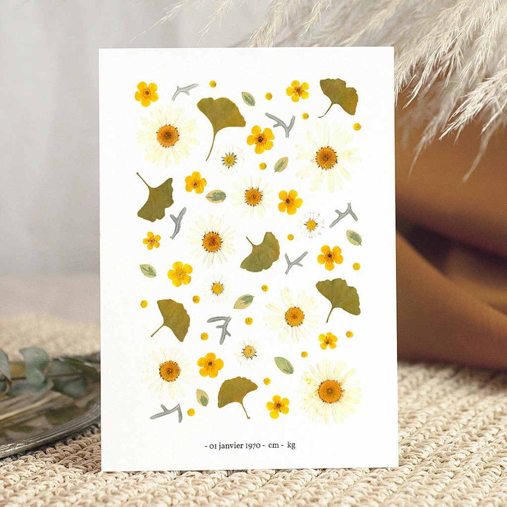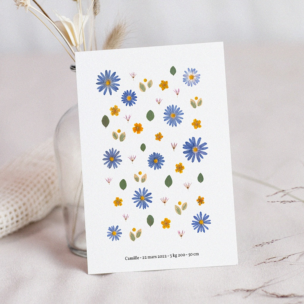 Création de 5 motifs bucoliques de fleurs pressées déclinés sur la papeterie naissance et mariage.