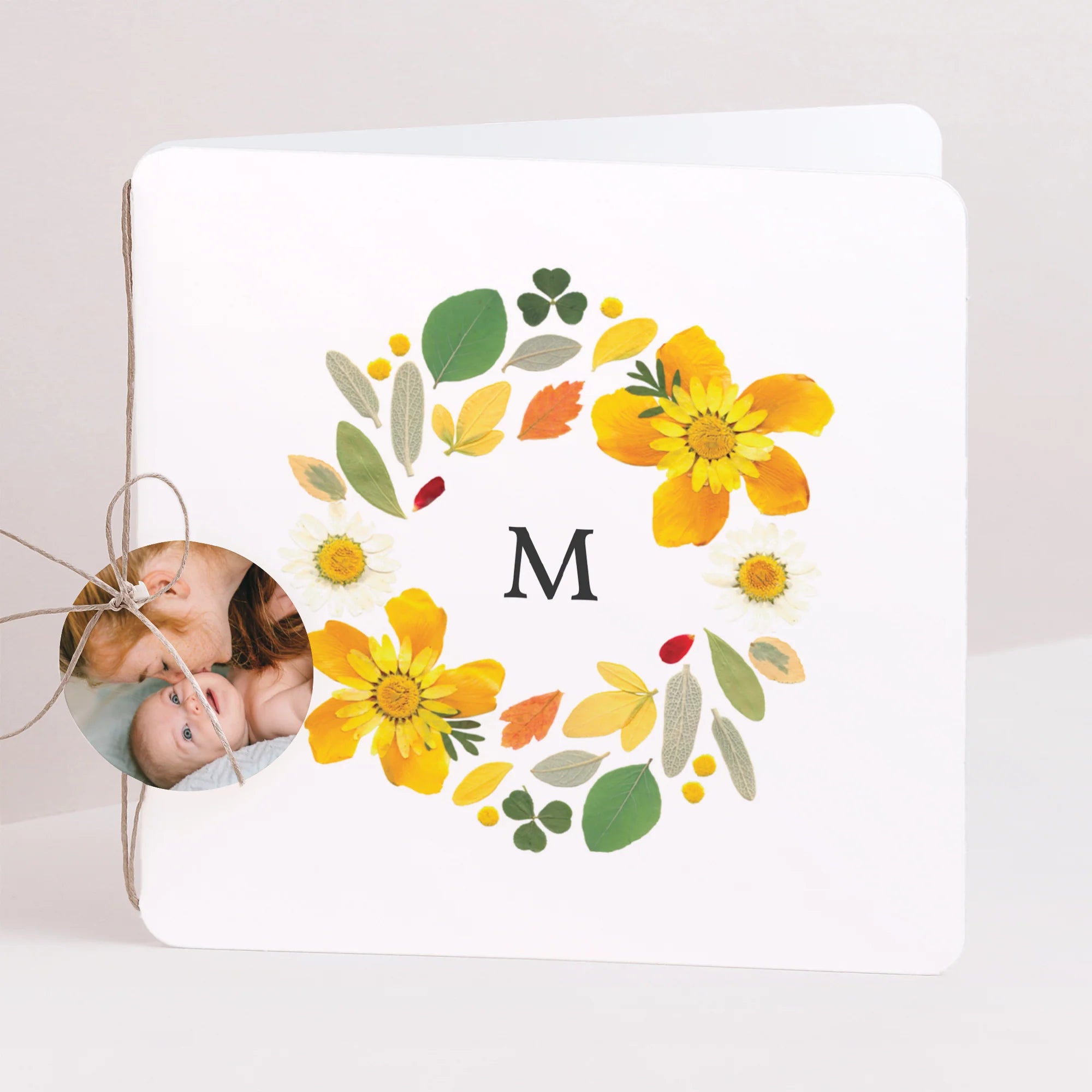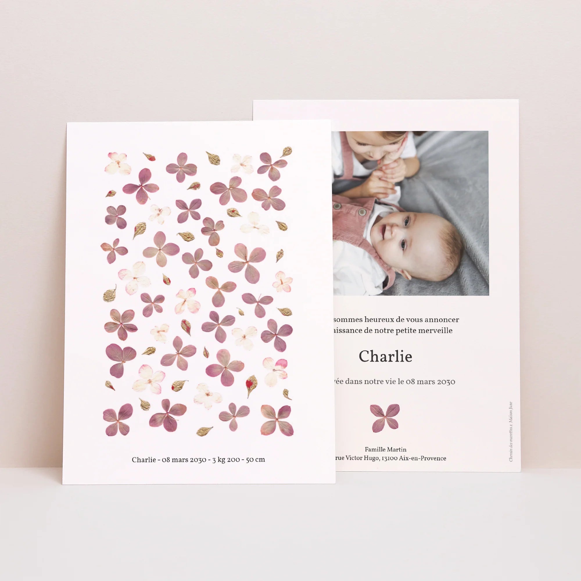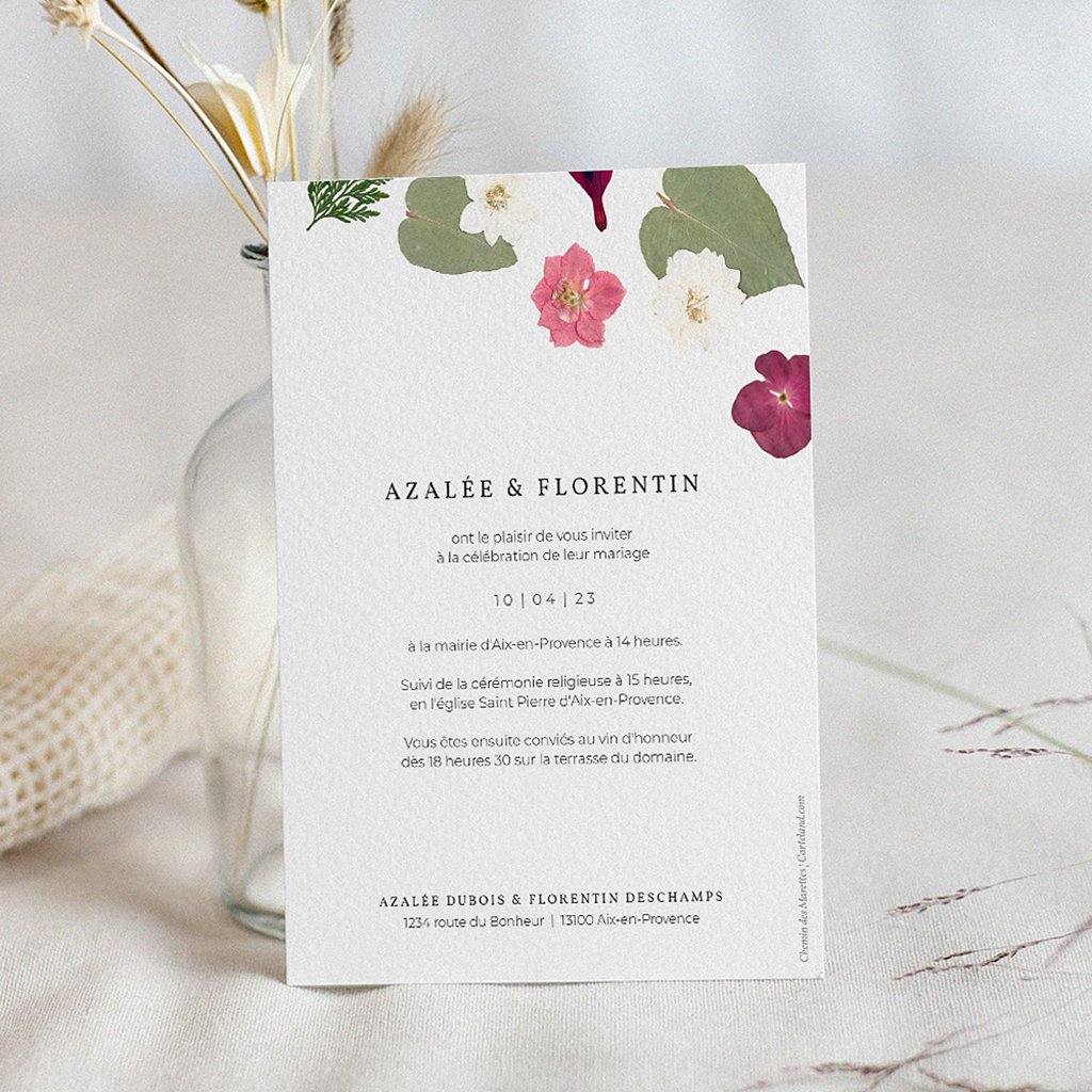 Création de 5 motifs bucoliques de fleurs pressées déclinés sur la papeterie naissance et mariage.